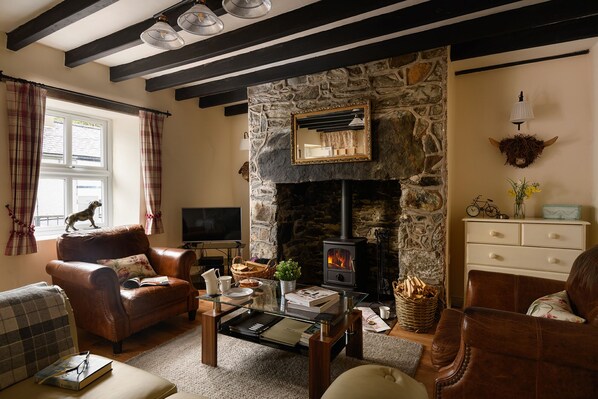 The cottage has tiled flooring downstairs with the upstairs carpeted. The lounge has three seater settees, centre table and an open stone fireplace with log burner.