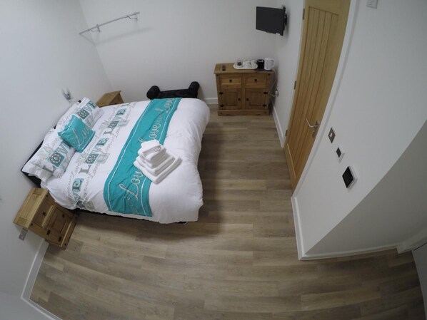 Wasn’t sure what to expect from this B&B and was more than pleasantly surprised. It’s a modern, well done refurbishment with a lovely bathroom, comfortable bed and plenty of space. With underfloor heating and a large floor stand fan most weather eventualities are covered. Plenty of power points including 4 USB sockets as well. Modern, clean and with fair storage space and hanging rail. Plenty of tea, coffee and sugar (in pots not packets) and a jug to collect fresh milk from the fridge in the Communal kitchen and dining area. This area was bright, clean and well stocked with 3 cereals, fresh fruit, bread for toast, butter and jam for a do it yourself breakfast. Even had biscuits to go with your tea. Plenty of tables and chairs for dining and a full load of menus to order in a takeaway, whilst watching the large screen TV. I recommend the Milano Italian who deliver but is actually a 2 minute stroll away and they do dine in. The Merlot was one of the nicest I’ve had in a while and all their food and drink was reasonably priced. Back to Deepcut Lodge, I will happily stay here again if in the area. The electronic keypad locks mean you need to phone or text to get your access code but messages / texts are responded to very promptly. With a modern CCTV and Fire Detection/Alarm system I felt very safe. A quiet area with a couple of takeaways and a cafe less than 3 minute walk away.