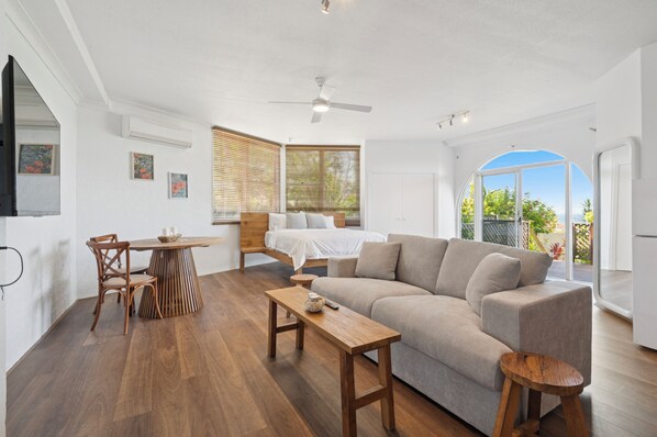 The studio features bed, lounge, kitchen, deck. There is a queen. The spacious open-plan living area looks out over the ocean and flows onto a deck with BBQ and outdoor dining area, perfect for relaxed coastal evenings..