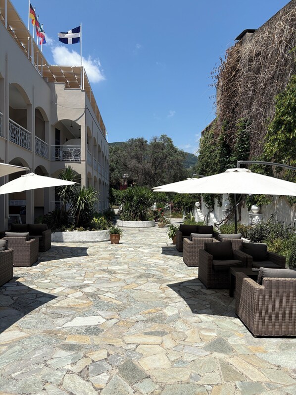 Benitses Arches sits right by the ocean, offering views of the water from throughout the property, with garden paths to stroll and scenic cycling routes nearby.