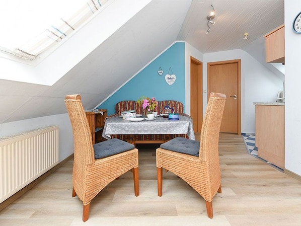Size about 50 square meters, living room with integrated kitchen, bedroom, second separate bedroom / children's room, bathroom with shower, vanity and toilet, upstairs, ideal for 2 to 3 people and in addition a toddler.