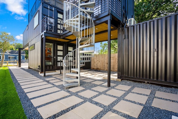 Modern one bedroom container-style guest house with full kitchen, dog friendly