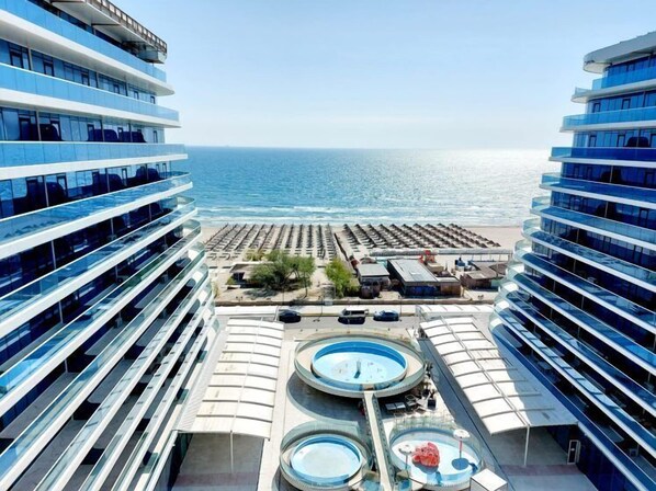 Recreational amenities at the aparthotel include a private beach and a seasonal outdoor pool.