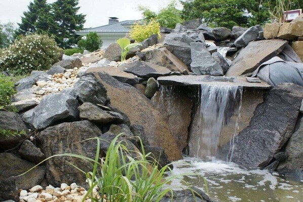 Stylish holiday apartment in the "Maarberg Resort" apartment complex in Schalkenmehren am See. With a 2-person whirlpool! Non-smoking apartment. The "Maarberg Resort" apartment complex has been newly renovated and refurbished. It is beautifully situated on the outskirts of Schalkenmehren am See. A quiet hillside location at the edge of the forest. The lake and the town center are only about 400 meters away. The town offers good restaurants, cafes, and a shopping area. In the district town of Daun, 5 km away, you will also find many shops and supermarkets. From some of the apartments in the Maarberg Resort, you can enjoy beautiful views of the lake. Each apartment has Wi-Fi access. Internet/Wi-Fi: Free use in all rooms! In the building: Lobby with reception, seating, and games (available for use). The new sauna and jacuzzi are located in the basement of the "Maarberg Resort" (free use). You can also use these facilities alone (lockable). There is also a room in the basement with a washing machine, dryer, iron, and ironing board. In the reception hall, you will find hiking maps and postcards, as well as free information about the many excursion destinations and leisure activities in the region. There is also a drinks fridge in the reception hall with drinks available for purchase on a trust basis. The outdoor area will delight you! Two wonderfully and elaborately landscaped ornamental ponds with koi and other fish, two waterfalls, two streams, and a well-maintained decorative gravel area are part of the property. There are also turtles in the upper pond. Sit comfortably with a coffee or cocktail on the balcony or terrace and watch the fish and turtles. Or gaze down into the valley at the lake. Further outdoor areas include ample parking and a bicycle parking area. A barbecue area with a view of the lake is located behind the house. Maarhöhe Holiday Apartment in the Maarberg Resort: Elegant, completely newly furnished holiday apartment for 2 to 6 people. Approximately 54 sqm of living space, balcony facing the lake and the lower ornamental pond with a wonderful panoramic view of the lake, the two ornamental ponds, the waterfalls, streams, and the decorative gravel area. The Maarhöhe holiday apartment is located on the upper floor (1 flight of stairs up). In the beautiful living room, you'll find a new sofa set that converts into a bed and a large, 127 cm HD/3D TV of the latest generation. You can choose from approximately 3,000 different TV and radio channels in many languages from 4 different satellites. There is also a 3D Blu-ray player and DVD player. A music system with radio, CD, etc. is also located in the apartment. Internet access with Wi-Fi is available. The bright and welcoming apartment exudes a natural flair with plenty of wood and stone. The electric fireplace and an elegant ceiling fan also create a special, cozy atmosphere. This creates a special holiday atmosphere even on cold and wet days. This is a non-smoking apartment (smokers please use the balcony or outdoor area). The new fitted kitchen has a 4-burner stove (ceramic hob) and oven, dishwasher, refrigerator with freezer, microwave, 2 coffee machines (filter and pod machine, Bosch Tassimo). Toaster, kettle, etc. Pots and pans as well as cutlery and dishes for the maximum number of people are of course provided. A cot and highchair can be provided free of charge. The dining area is suitable for 4 people. The apartment has 2 separate bedrooms with high-quality box spring beds (180 cm x 200 cm and 140 cm x 200 cm). Nothing stands in the way of a good night's sleep. The second bedroom has a 140 cm wide French double bed. You can also enjoy a view of the lake from the larger bedroom! There are also full-length mirrors in the bedrooms. The living room features a new double sofa bed for additional sleeping space. The bathroom has a whirlpool! The bright bathroom features a whirlpool. Pamper yourself in the whirlpool. The bathroom is equipped with a satellite TV with a DVD player. A radio with a USB port is also available. Special bath salts for the whirlpool are provided free of charge. The whirlpool features a shower attachment with a rain shower, side massage jets, and LEDs. The blue LED floor lights throughout the bathroom create a wonderful atmosphere. A large, illuminated LED mirror, a hotel hairdryer, and a bathroom scale are provided. Modern heating with a towel warmer. The apartment has a lovely balcony with lounge chairs and a cocktail or coffee table. If you'd like to enjoy a really good meal on the balcony, you'll find another dining table that folds down to each floor. Layout: Basement: (relaxation area(Make Up Mirror, Mirror, sauna, Turkish steambath, hot tub)) Fax, Fire Alarm, Hot Water, Internet Access ISDN, Vacuum Cleaner, hallway(Wardrobe Coatrack), Living room(Armchair, Fan, Games, Mirror, Sofa, Wardrobe Coatrack, library, single sofa bed, TV, TV, dining table, fireplace, stove, DVD player, Blu-ray player, radio, CD player, stereo unit, cot, high chair), Kitchen(Tea Towels, Kitchenette, dining table, hob, electric kettle, toaster, cooker, coffee machine, oven, microwave, dishwasher, fridge, freezer, Food processor), open kitchen, Living/bed room(single sofa bed), Living/diningroom(TV), bedroom(Bed Linen, single sofa bed, double bed, double bed, cot, children's bed), bedroom(Bed Linen, single sofa bed, double bed, double bed, cot, children's bed), bathroom(Make Up Mirror, Mirror, toilet, bath tub, hot tub, shower, washbasin, hairdryer), Internet access, Internet access, First Aid, game computer, tumble dryer, washing machine, balcony(Sun Umbrella, garden furniture), heating, terrace(Sun Umbrella, Barbecue center, grill, garden furniture, sun loungers, pond, Swing set), garden(Barbecue center, Lawn, garden furniture, sun loungers, pond), parking, ironing board, iron, drying cabinet, Laundry Package for a fee, telephone