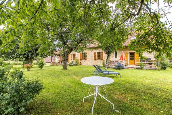Elegant authentic Burgundian farmhouse of character from 1780 steeped in history (one of the oldest in the village, family home for several generations) carefully restored into a comfortable holiday resort, nestled in peace on the immediate edge of a meadow where peaceful Charolais cows graze in season. Pleasant preserved rural environment in the heart of the Cluny Romanesque countryside, nestled in the heart of the bucolic Guye valley (& its fish-filled river), sublime hilly setting of nature & greenery, alternating vineyard hillsides, vast bocage, forest and waterways. In the heart of the picturesque little village of Bonnay, a charming typical village which contributed to the extraordinary influence of Cluny Abbey, from the 10th to the 18th century, rich in magnificent landscapes and an absolutely unique heritage (listed medieval hamlet with Château du 14th century, listed Romanesque chapel from the 11th century, historic stately homes & traditional rural houses from the 16th and 17th centuries / 15th century castle / remains of one of the very first fortified churches in Burgundy dating from the 11th century / 13th century cross classified MH…). Ultra relaxing setting & site. Spacious gîte with very good comfort. Warm country style with contemporary accents mixing country chic atmosphere and industrial touches. Lots of charm, style and character. Cozy & cocooning. Complete quality equipment. Large exposed and shaded terrace opening onto a pleasant, well-kept garden with trees of 700m² (cherry trees, peach trees, etc.), a favorite play area for children, with an intimate relaxation-meal area nestled under the trees. Composition: Detached house adjoining the owners' home (total independence without vis-à-vis). Wireless. Gas central heating. Private laundry room with exterior access. Ground floor: living room-kitchen, TV lounge, bathroom (shower), separate toilet. 1st floor: 2 bedrooms (2 single beds 90x190cm / 1 double bed 160x200cm). Garden + terrace + bicycle room + private parking. Shops 4 km. Calm & comfort nestled on a site imbued with great history! Elegant authentic Burgundian farmhouse with character from 1780, fully restored with great care - with a large pleasant wooded garden - nestled on the edge of pastures & meadows, in the heart of a peaceful and picturesque little typical village classified as a "Clunisian site", located in 10 km from the charming medieval town of Saint-Gengoux-le-National, a typical wine-growing & shopping town labeled Cités de Caractère de Bourgogne-Franche-Comté (all amenities on site). Superb hilly landscaped setting in the heart of the Cluny wine-growing countryside, at the crossroads of the bucolic vineyards of Mâconnais & Côtes Chalonnaises, in the hollow of a magnificent preserved setting of nature & greenery, neighboring several protected areas classified "Natura 2000" for their remarkable ecosystem. Ultra privileged location adjoining the wine route, on the routes of the Romanesque church circuit, several marked hiking trails for "green walks" winding between vineyards and open nature & the GR76 (Saint-Jacques de Compostela), a loop bike referenced "favorite" of 27 km (another route of the same type of 24 km accessible 6 km away), 6 km from the greenway & 12 km from the reference mountain bike route of the Grand Tour du Massif Sud Bourgogne ( GTM). Prime central location at the crossroads of Chalonnais, Tournugeois-Clunisois (labeled "Country of Art and History"), Mâconnais, Bresse Bourguignonne & Charollais-Brionnais (labeled "Country of Art and History") "), all rich in sublime landscapes, renowned gastronomy and an exceptional historical heritage. The perfect "spot" to explore all of southern Burgundy: 9 km from Taizé (& its famous religious community), 17 km from the illustrious abbey city of Cluny, 28 km from Tournus (world-renowned abbey site), 34 km from Charolles, 37 km from Chalon-sur-Saône (labelled City of Art and History), 36 km from Charolles, 38 km from the landscaped jewel of the Solutré & Vergisson rocks labeled Grand Site de France, 40 km from Mâcon (Mâcon Loché TGV station at 37 km), 45 km from Le Creusot (renowned amusement park of Les Combes / Creusot TGV station at 34 km), 47 km from Paray-le-Monial, 48 km from La Clayette & 56 km from Louhans. The ideal cocoon for a cozy country break, 100% relaxing between nature & culture!