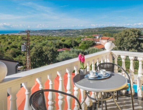 Each floor is larger than 100m2. It has a beautiful courtyard and three terraces, anteroom and stairs are lined with a very high quality stone (granite). On large terrace has table, chairs, umbrella suitable for the whole group, breakfast or sit and enjoy with a view of nature or view. Nice view of the sea, Slovenie, Italie and Alpe. Refreshment is provided by the pool in the garden.