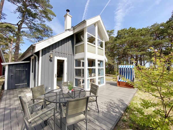 The pet-free, non-smoking holiday home & # 132; grains of sand & # 147; offers enough space for 4 adults and 1 toddler up to 3 years in a cot. The 80 square meter wooden house in typical Scandinavian style is very lovingly furnished and offers high-quality furnishings on two floors. It is located on the ground floor a large living and dining area with fireplace and flat-screen TV, DVD player and a radio-CD player. Even on an internet connection over WLAN no need to leave on vacation. This is included for you. Two comfortable leather couches with coffee table and a sideboard guarantee relaxing evenings. Insect screens are located on the ground floor and the patio door. The light-filled stylish dining area with solid wood furniture offers plenty of space for 4 people. The modern kitchen is equipped with everything you need for everyday life. Therefore, include a refrigerator, an oven with ceramic hob and extractor hood, a microwave, a dishwasher, a nickel-free kettle, coffee maker, toaster, blender, tea pots, crockery and cutlery and of course all other utensils for cooking and eating for Inventory , Also part of the ground floor is a bedroom with a double bed (1.80 m x 2.00 m) with high-quality cold foam mattresses and adjustable slatted frames, a bedside table and a bedside table and a three-door wardrobe with mirror. Insect screens and blackout pleats ensure a peaceful, restful sleep here. The spacious bathroom with shower, whirlpool, sauna, washing machine, hair dryer and large sink will inspire you. You can reach it from the corridor, which is furnished with shoe cabinet, wardrobe and mirror. In the living room and in the bathroom floor heating and welcome heat. In the first Floor is a bright gallery with large windows and comfortable seating, a small table and reading lamp with views to the sea and the pine forest. The second bedroom, cozy under sloping ceilings, is accessible from here. It is equipped with 2 single beds (0.90 mx 2.00 m), 2 bedside tables, a sturdy cot and a wardrobe. The window is also provided here with a Verdunklungsplissees and insect screens. For our little guests are 1x high chair and 1x stable cot (without Bettinlett) included. The house is certified with the ECARF seal for allergy friendliness and therefore pets are not allowed. On the spacious furnished wooden terrace (southeast / west) a beach chair (May-September), sun beds and a parasol have additionally found their place. For your wheels located at the house, a bicycle stand. In cultivation shed can accommodate various beach equipment. A parking space (no. 271) is located in front of the house. In the months of November to April, 1 box of firewood is included. The initial equipment of a linen package (complete linen, 1 shower towel, 2 small towels) you can until 14 days before arrival for 15.00 & # 128; Book per person or supplement by own. For packages booked for 2 or more you will receive 1 dish towel and 1 shower mat once. The prepayment of consumption costs will be calculated according to individual consumption (electricity 0,39 Euro / KWh, water 7,50 Euro / m³) and will be refunded after departure.   Please note: The houses in the beach park are in a biosphere reserve, so the barbecue with an open fire is not allowed.