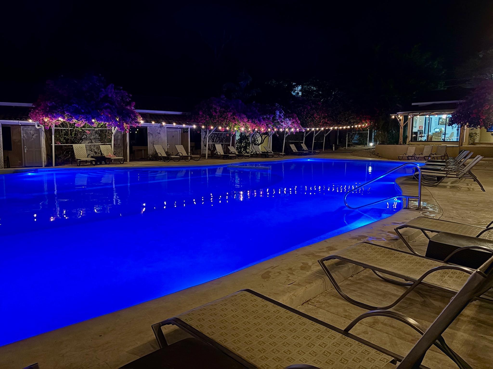 حمام سباحة مكشوف مع مقاعد للتشمس