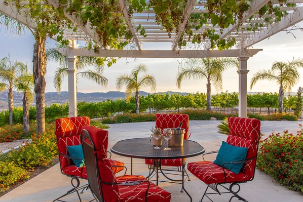 Welcome to our serene and secluded hilltop villa estate, situated on 3.5 acres of private countryside overlooking the picturesque vineyards of Temecula Valley's renowned Wine Country. Enclosed by fencing and gated for your privacy and security, our retreat offers a tranquil and peaceful oasis amidst the surrounding mountains and lush landscapes. Enjoy the quiet serenity of our estate as you relax and unwind in this idyllic setting.