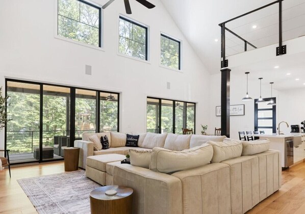 Escape to this beautiful home on Tims Ford Lake, where you can unwind with lake views from the outdoor covered porch or explore the water with SUPs and a kayak. With a billiards table, foosball, shuffleboard, arcade game, and movie projector in the game room plus a fire pit and porch seating outside - there's always something exciting to do.